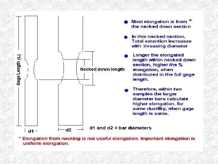 Measurement Methods and Facts • % Elongation, when measured in a fixed gage length, e. g. 8 inches, is lower than when measured in a gage length, as a multiple of diameter, e. g. 4 X diameter (4 d). (when 4 d is less than fixed gage length). • Elongation is generally lower as diameter goes smaller. • This fact is clearly described in ASTM E 8, Appendix XI