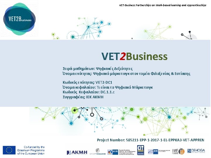 VET-Business Partnerships on Work-based learning and Apprenticeships Ευχαριστούμε για την προσοχή σας! www. vet 2 business. eu ΑΚΜΗ Ανώνυμη Εκπαιδευτική Εταιρεία Κοδριγκτώνος 16, 11257, Αθήνα https: //iek-akmi. edu. gr/ @VET 2 Business @Vet 2 business. P Any copyright and Intellectual property laws must be respected and are the responsibility of the author. Project Number: 585211 -EPP-1 -2017 -1 -EL-EPPKA 3 -VET-APPREN