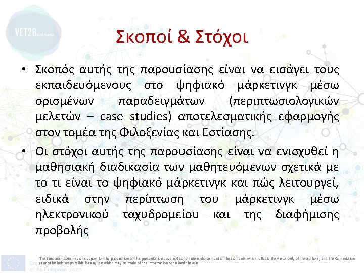 Μαθησιακά Αποτελέσματα • Στο τέλος αυτής της ενότητας, θα είστε σε θέση να: – Ορίσετε τι είναι το μάρκετινγκ ηλεκτρ. ταχυδρομείου (email marketing) – Ορίσετε τι είναι η διαφήμιση προβολής (display advertising) – Κατανοήσετε τη λειτουργία του μάρκετινγκ ηλεκτρ. ταχυδρομείου (email marketing) – Κατανοήσετε τη λειτουργία της διαφήμισης προβολής (display advertising) The European Commission support for the production of this presentation does not constitute endorsement of the contents which reflects the views only of the authors, and the Commission cannot be held responsible for any use which may be made of the information contained therein