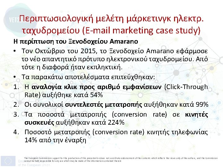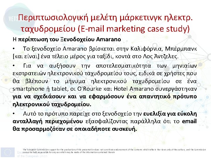 Πίνακας Περιεχομένων • Περιπτωσιολογική μελέτη μάρκετινγκ ηλεκτρ. ταχυδρομείου (E-mail marketing case study) – Η περίπτωση του Hotel Amarano • Περιπτωσιολογική μελέτη Διαφήμισης Προβολής (Display Advertising case study) – Η περίπτωση ενός Oceanfront Hotel The European Commission support for the production of this presentation does not constitute endorsement of the contents which reflects the views only of the authors, and the Commission cannot be held responsible for any use which may be made of the information contained therein