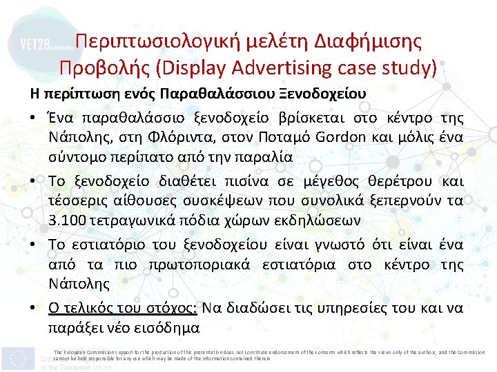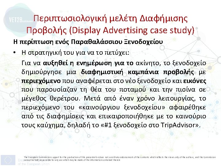 Περιπτωσιολογική μελέτη Διαφήμισης Προβολής (Display Advertising case study) H περίπτωση ενός Παραθαλάσσιου Ξενοδοχείου • Αποτελέσματα 1. $137, 789 σε παραγόμενα έσοδα 2. 257 κρατήσεις από την ιστοσελίδα 3. 46: 1 ROI - Επιστροφή επί της επένδυσης 4. 571, 959 εμφανίσεις The European Commission support for the production of this presentation does not constitute endorsement of the contents which reflects the views only of the authors, and the Commission cannot be held responsible for any use which may be made of the information contained therein