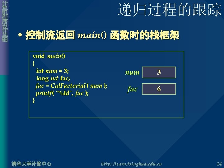 计 算 机 程 序 设 计 基 础 递归过程的跟踪 • 第一次调用 Cal. Factorial() 执行后栈框架 long int Cal. Factorial( int n ){ long int result; if( n == 0 || n = 1 ) result = 1; else result = n * Cal. Factorial( n – 1 ); return result; } 清华大学计算中心 http: //learn. tsinghua. edu. cn 13