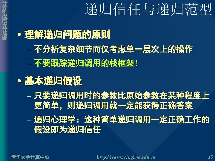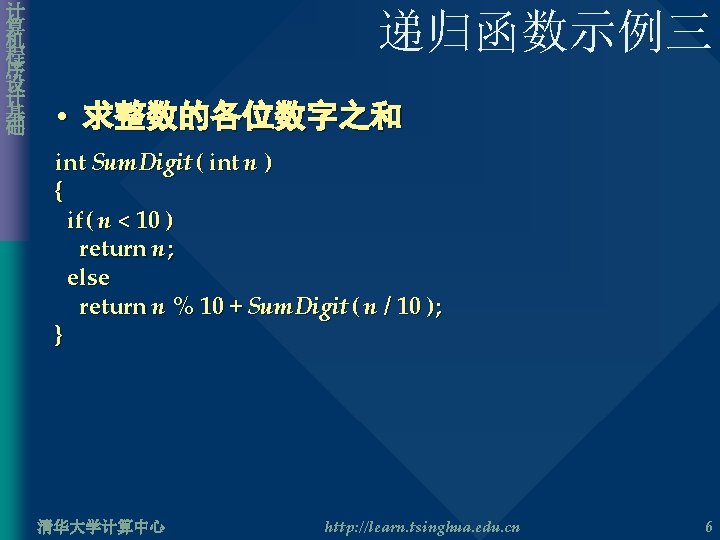 计 算 机 程 序 设 计 基 础 递归函数示例二 • 幂的计算 long double Cal. Power( long double x, int n ) { long double result; if( n == 0 ) result = 1; else result = x * Cal. Power( x, n – 1 ); return result; } 清华大学计算中心 http: //learn. tsinghua. edu. cn 5