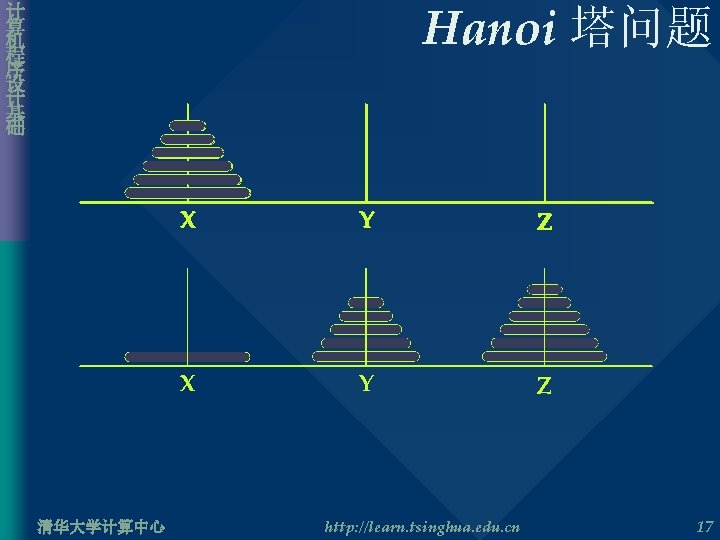 计 算 机 程 序 设 计 基 础 Hanoi 塔问题 • 递归算法的伪代码 void Move. Hanoi. Tower( int num, char source, char temp, char dest ) { if( n == 1 ) 将一个圆盘从 source 移动到 dest else { 将 n – 1 个圆盘从 source 移动到 temp 将圆盘 n 从 source 移动到 dest 将 n – 1 个圆盘从 temp 移动到 dest } } 清华大学计算中心 http: //learn. tsinghua. edu. cn 18