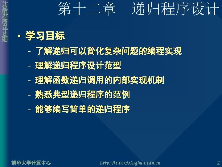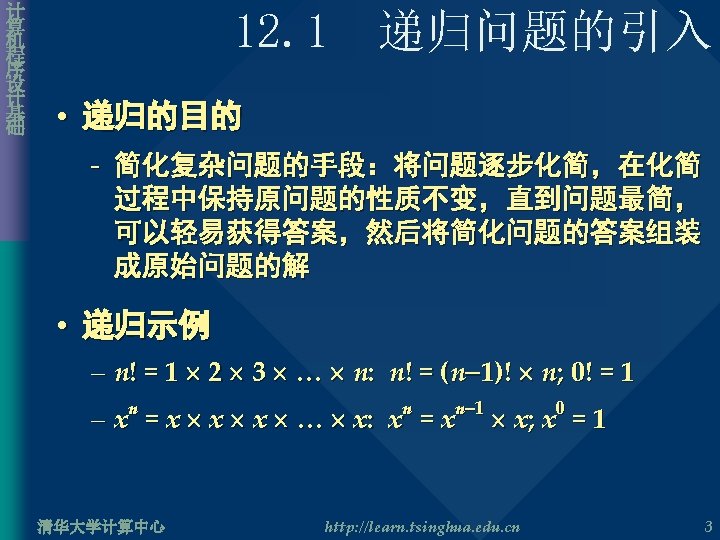 计 算 机 程 序 设 计 基 础 递归过程的跟踪 • 第三次调用 Cal. Factorial() 执行后栈框架 long int Cal. Factorial( int n ){ long int result; if( n == 0 || n = 1 ) result = 1; else result = n * Cal. Factorial( n – 1 ); return result; } 清华大学计算中心 http: //learn. tsinghua. edu. cn 11