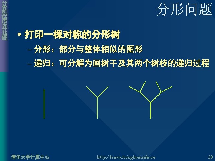 计 算 机 程 序 设 计 基 础 Hanoi 塔问题 • 递归算法 void move( char source, char dest ){ printf( “%c->%c”, source, dest ); } void Move. Hanoi. Tower( int num, char source, char temp, char dest ){ if( num == 1 ){ move( source, dest ); } else{ Move. Hanoi. Tower( num – 1, source, dest, temp ); move( source, dest ); Move. Hanoi. Tower( num – 1, temp, source, dest ); } } 清华大学计算中心 http: //learn. tsinghua. edu. cn 19