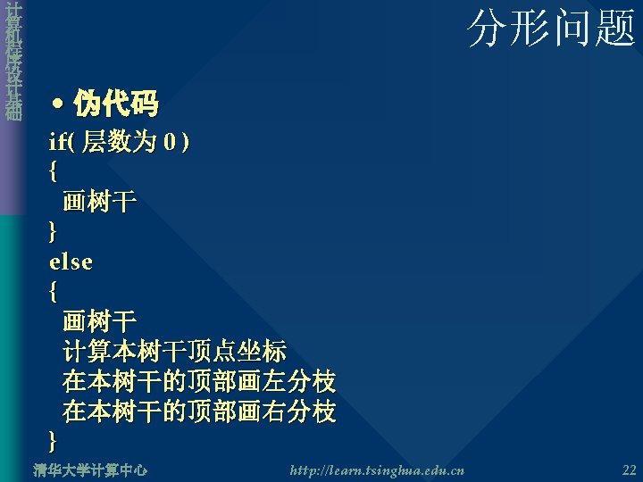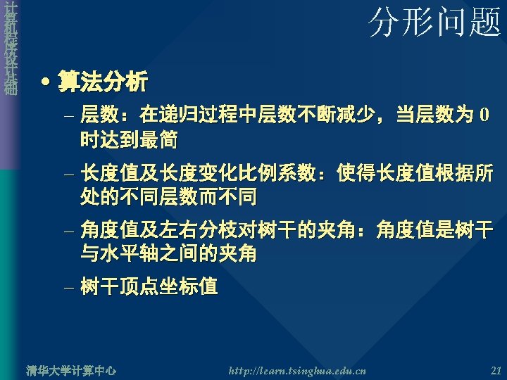 计 算 机 程 序 设 计 基 础 分形问题 • 算法初步实现 void Draw. Fractal( double length, double scale, double alpha, double delta, double cx, double cy, int order ) { if( order == 0 ) { 画树干,当前点 (cx, cy),长度为length,水平夹角 alpha } else { 画树干,当前点 (cx, cy),长度 length,水平夹角alpha 计算新的线段顶点坐标 (cx, cy) 画右分枝,新顶点 (cx, cy),长度 length * scale,水平夹角 alpha – delta 画左分枝,新顶点 (cx, cy),长度 length * scale,水平夹角 alpha + delta } } 清华大学计算中心 http: //learn. tsinghua. edu. cn 23