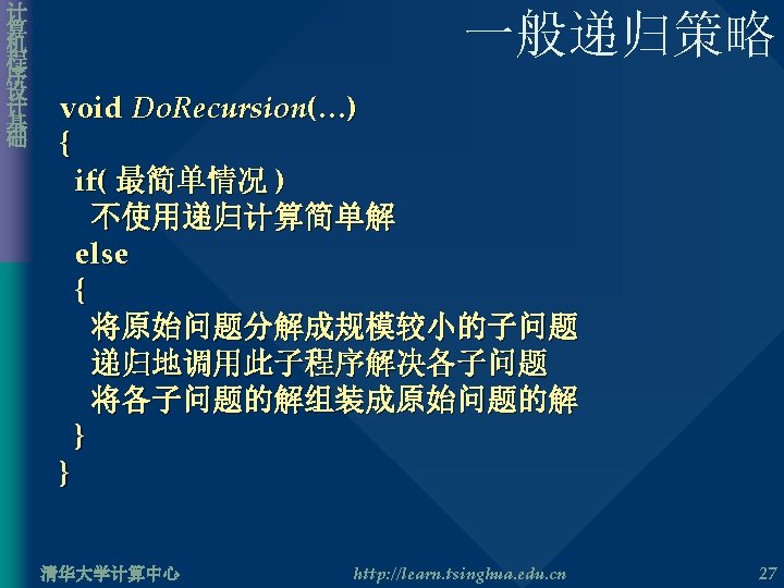 计 算 机 程 序 设 计 基 础 其他递归问题二 • 折半查找 int Binary. Search( int a[], int key, int low, int high ) { int mid = ( low + high ) / 2; if( low > high ) return – 1; if( key == a[mid] ) return mid; else{ if( key < a[mid] ) return Binary. Search( a, key, low, mid – 1 ); else return Binary. Search( a, key, mid + 1, high ); } } 清华大学计算中心 http: //learn. tsinghua. edu. cn 26