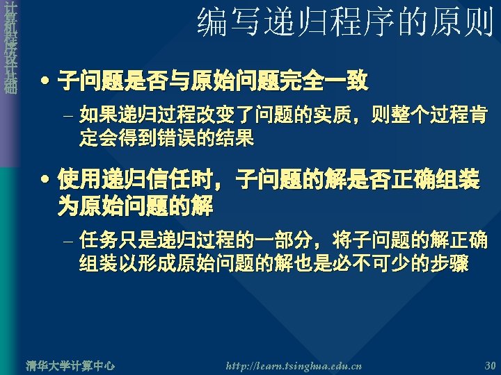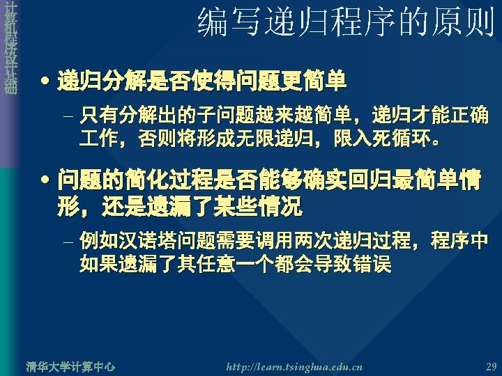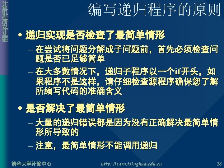 计 算 机 程 序 设 计 基 础 其他递归问题一 • Pascal 三角形 int Pascal. Triangle( int n, int k ) { if( k==0 || k==n ) return 1; else return Pascal. Triangle(n– 1, k– 1) + Pascal. Triangle(n– 1, k); } 清华大学计算中心 http: //learn. tsinghua. edu. cn 25
