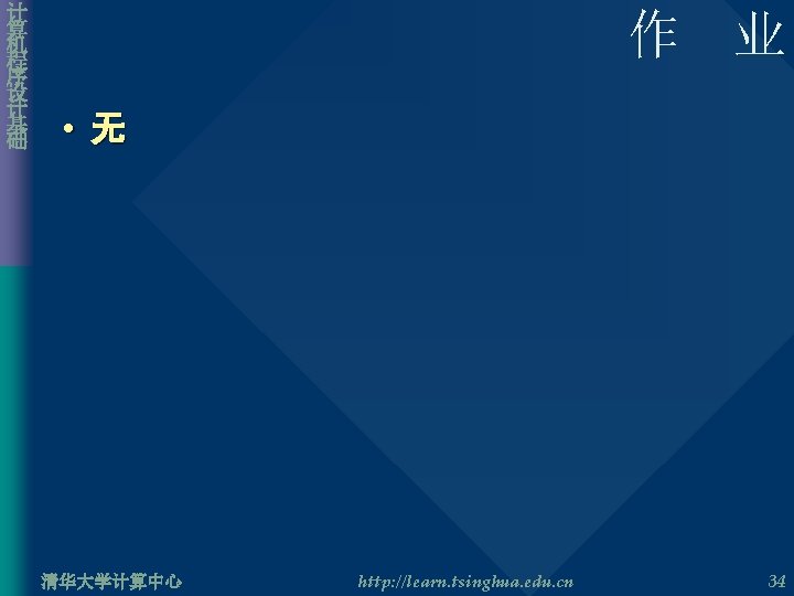 计 算 机 程 序 设 计 基 础 12. 3 递归与迭代 • 迭代算法实现 long int Fabonacci( int n ) { int i, f, f 1 = 1, f 2 = 1; if( n == 1 || n == 2 ) return 1; else for( i = 3; i <= n; i++ ){ f = f 1 + f 2; f 2 = f 1; f 1 = f; } return f; } 清华大学计算中心 http: //learn. tsinghua. edu. cn 33