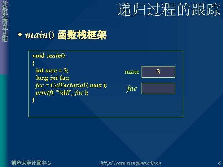 计 算 机 程 序 设 计 基 础 递归过程的跟踪 • 阶乘的计算 #include <stdio. h> long int Cal. Factorial( int n ){ long int result; if( n == 0 || n = 1 ) result = 1; else result = n * Cal. Factorial( n – 1 ); return result; } void main(){ int num = 3; long int fac; fac = Cal. Factorial( num ); printf( “%ld”, fac ); } 清华大学计算中心 http: //learn. tsinghua. edu. cn 7