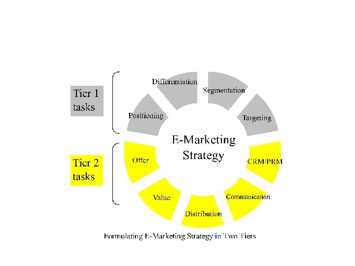 Step 2—Link E-Business with E -Marketing Strategy n Marketers need to: 1 Review the marketing and e-business plans, 2 Conduct a strategic planning to help achieve the firm’s ebusiness goals + define potential revenue streams, 3 Create supporting e-marketing strategy for the e-business goals: A Tier one strategy: marketers design segmentation, targeting, differentiation, and positioning strategies, B Tier two strategy deals with the 4 P’s and relationship management by creating strategies around the offer (product), value (pricing), distribution (place), and communication (promotion), 4 Further, marketers design customer and partner relationship strategies (CRM/PRM).
