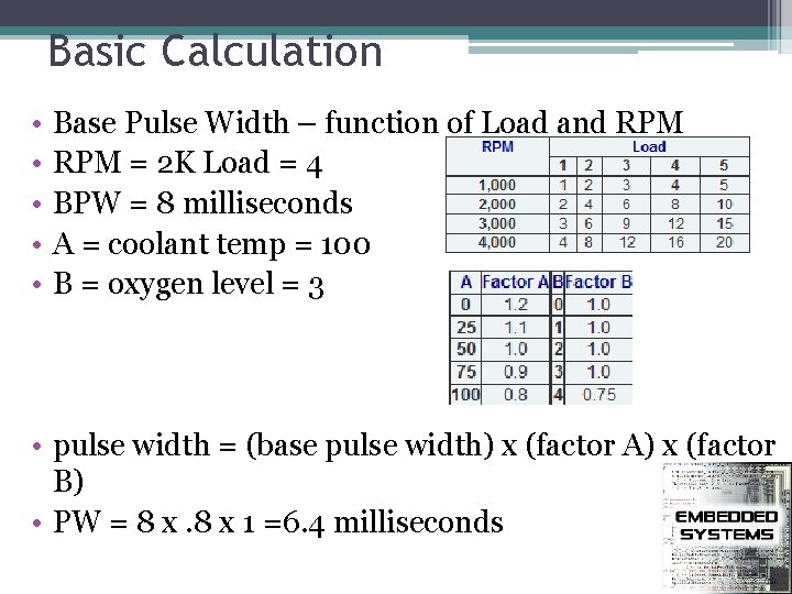 Basic Calculation • • • Base Pulse Width – function of Load and RPM = 2 K Load = 4 BPW = 8 milliseconds A = coolant temp = 100 B = oxygen level = 3 • pulse width = (base pulse width) x (factor A) x (factor B) • PW = 8 x 1 =6. 4 milliseconds