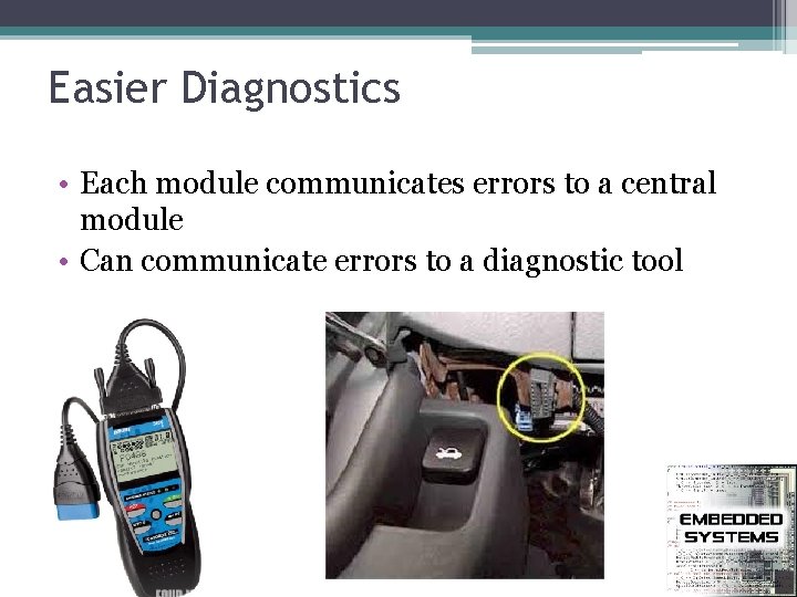 Easier Diagnostics • Each module communicates errors to a central module • Can communicate errors to a diagnostic tool