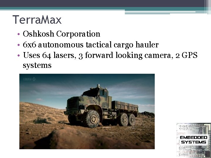Terra. Max • Oshkosh Corporation • 6 x 6 autonomous tactical cargo hauler • Uses 64 lasers, 3 forward looking camera, 2 GPS systems