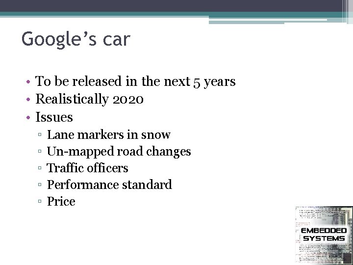 Google’s car • To be released in the next 5 years • Realistically 2020 • Issues ▫ ▫ ▫ Lane markers in snow Un-mapped road changes Traffic officers Performance standard Price