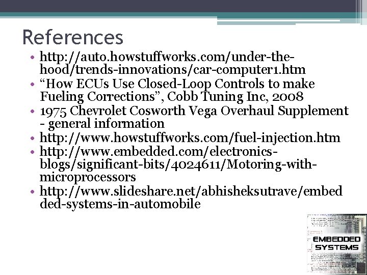References • http: //auto. howstuffworks. com/under-thehood/trends-innovations/car-computer 1. htm • “How ECUs Use Closed-Loop Controls to make Fueling Corrections”, Cobb Tuning Inc, 2008 • 1975 Chevrolet Cosworth Vega Overhaul Supplement - general information • http: //www. howstuffworks. com/fuel-injection. htm • http: //www. embedded. com/electronicsblogs/significant-bits/4024611/Motoring-withmicroprocessors • http: //www. slideshare. net/abhisheksutrave/embed ded-systems-in-automobile
