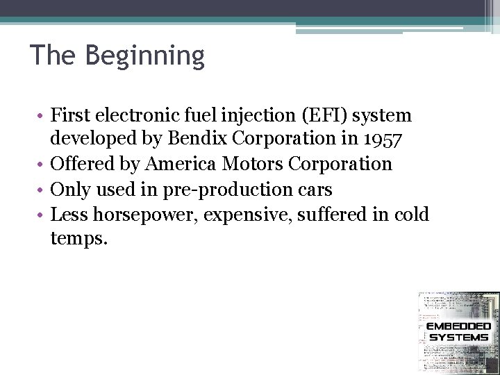 The Beginning • First electronic fuel injection (EFI) system developed by Bendix Corporation in 1957 • Offered by America Motors Corporation • Only used in pre-production cars • Less horsepower, expensive, suffered in cold temps.