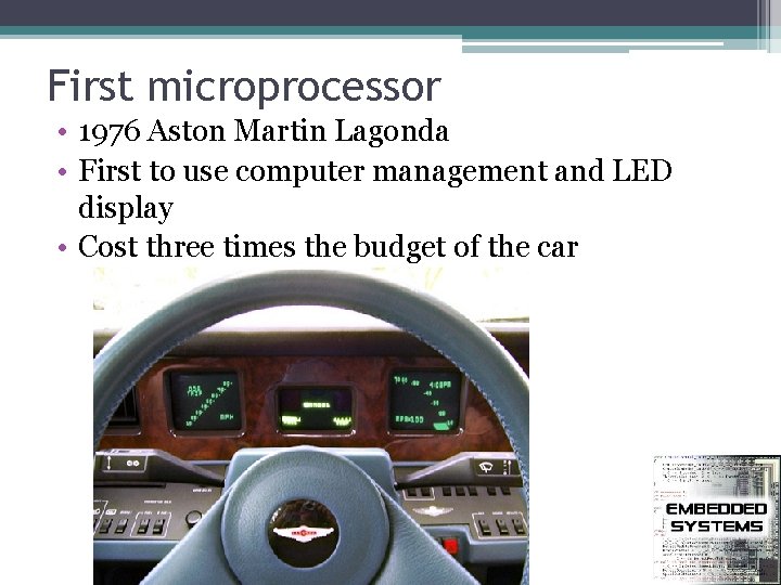 First microprocessor • 1976 Aston Martin Lagonda • First to use computer management and LED display • Cost three times the budget of the car
