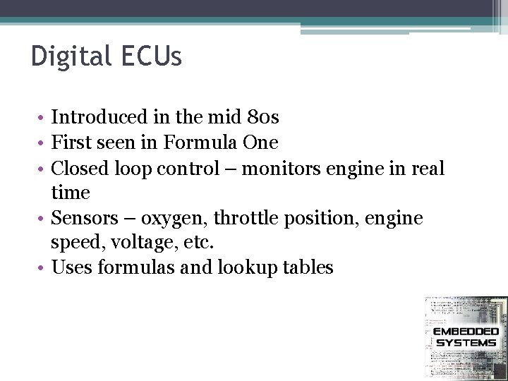 Digital ECUs • Introduced in the mid 80 s • First seen in Formula One • Closed loop control – monitors engine in real time • Sensors – oxygen, throttle position, engine speed, voltage, etc. • Uses formulas and lookup tables