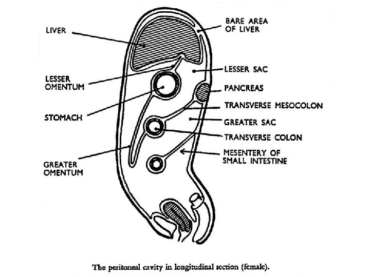 Fixation of the Gut i. e. fusion of mesenteries with the posterior parietal peritoneum renders some segments of the gut secondarily retroperitoneal. (Syllabus page 46 -47) The dark cross-hatched areas show the parts of the dorsal mesentery which have fused with the peritoneum of the posterior abdominal wall, making the associated organs secondarily retroperitoneal. Adapted from: Langman's Medical Embryology