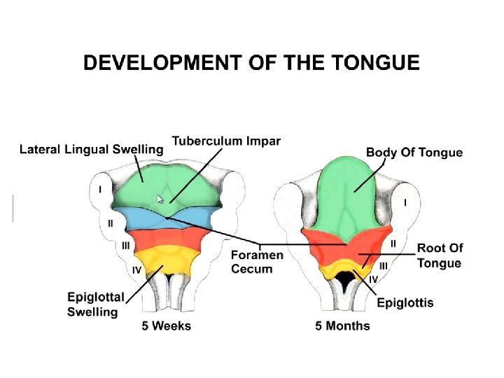 Time line of events • • 4 weeks – lingual swellings and tuberculum impar 5 weeks – hypopharyngeal eminence, thyroid 6 weeks – dental lamina 7 weeks – thyroid in definitive position 8 – 10 weeks – enamel organs 6 months – enamel, dentine, tongue 9 months – cementum Birth – periodontal ligaments
