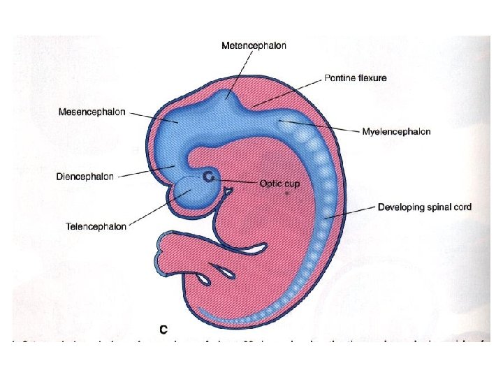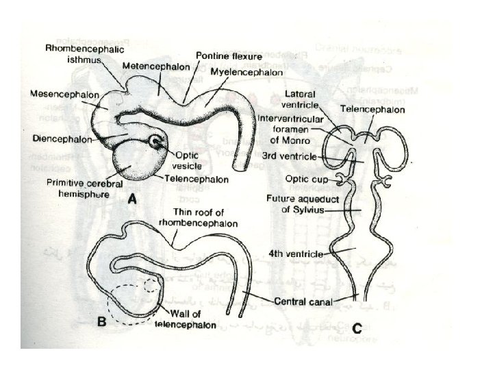 DIFFERENTIATION OF BRAIN • 5 th week: • Three primary brain vesicles appear : • Fore brain (Prosencephalon). • Mid brain (Mesencephalon). • Hind brain (Rombencephalon).
