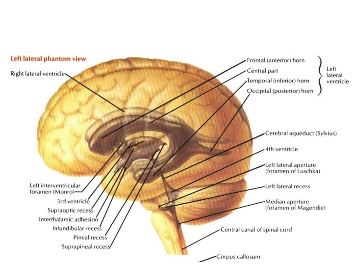 Ventricular spaces and central canal • • 1 -Telencephalon------ lateral ventricles 1&2 2 -Diencephalon-------third ventricle 3 -Mesencephalon----cerebral aqueduct 4 - Rhombencephalon--- forth ventricle 5 -Lumen of Spinal cord----- central canal 6 - in the end of spinal cord----- terminal ventricle Monro Foramen (interventricular Foramina)