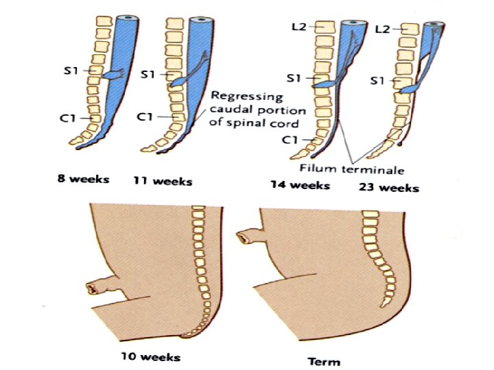 POSITIONAL CHANGES OF THE CORD • In the 3 rd month of development the spinal cord extends the entire length of the embryo, and spinal nerves pass through the intervertebral foramina at their level of origin. • With increasing age, the vertebral column and dura lengthen more rapidly than the neural tube, and the terminal end of the spinal cord gradually shifts to a higher level. • At birth, this end is at the level of the third lumbar vertebra. • As a result of this disproportionate growth, spinal nerves run obliquely from their segment of origin in the spinal cord to the corresponding level of the vertebral column. • The dura remains attached to the vertebral column at the coccygeal level. • In the adult, the spinal cord terminates at the level of L 1 to L 2, • The dural sac and subarachnoid space extend to S 2. • Below L 1 to L 2, a threadlike extension of the pia mater forms the filum terminale, which is attached to the periosteum of the first coccygeal vertebra and which marks the tract of regression of the spinal cord. • Nerve fibers below the terminal end of the cord collectively constitute the cauda equina.