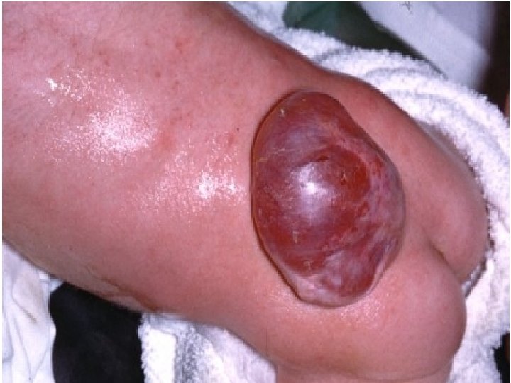 • Types: – Spina bifida occulta: The bone only is affected, while the spinal cord and the membranes are intact. There may be a patch of hairy skin or a dimple over the affected area. It has a good prognosis. No treatment is required. – Spina bifida cystica ‘ overta’ which includes: » Meningocele. It is protrusion and herniation of the meninges, through a bony deficit to the skin. » Meningomyelocele: It is a protrusion of heterotopic neural tissue with the meninges. The defect is in the midline and affects the skin of the back, muscles, bones of the vertebral arches and neural tube. The membrane is easily ruptured » Myelocele: No skin or meninges to cover the lesion. It is usually incompatible with life. 35