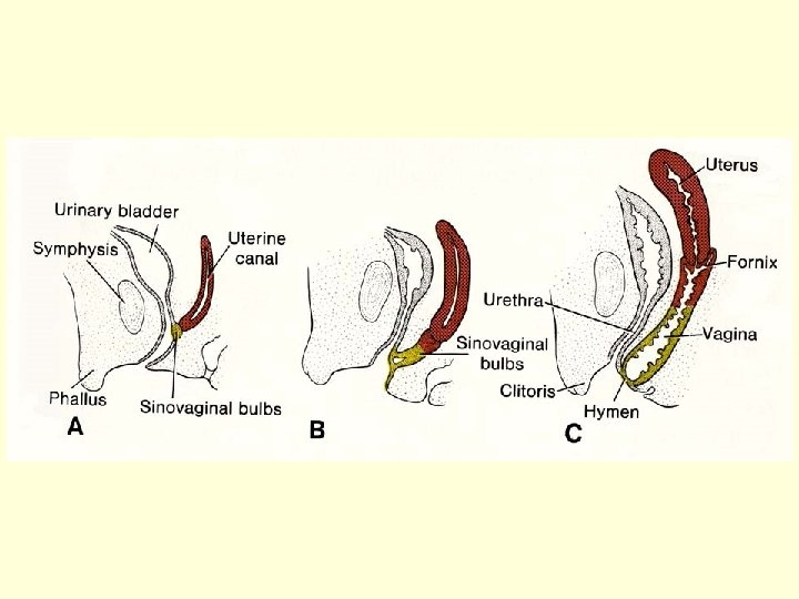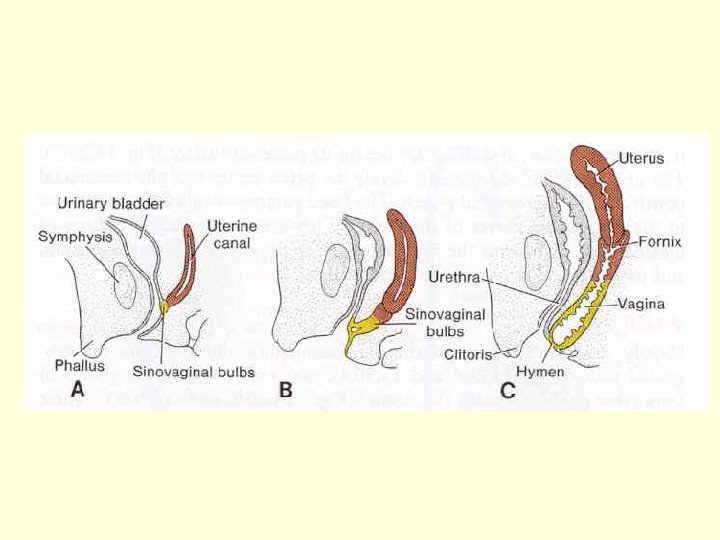 genital ridge Indifferent stage: Wolffian duct ♂ Müllerian duct ♀ sinus urogenitalis mesonephric ridge uterovaginal tubercle gubernaculum