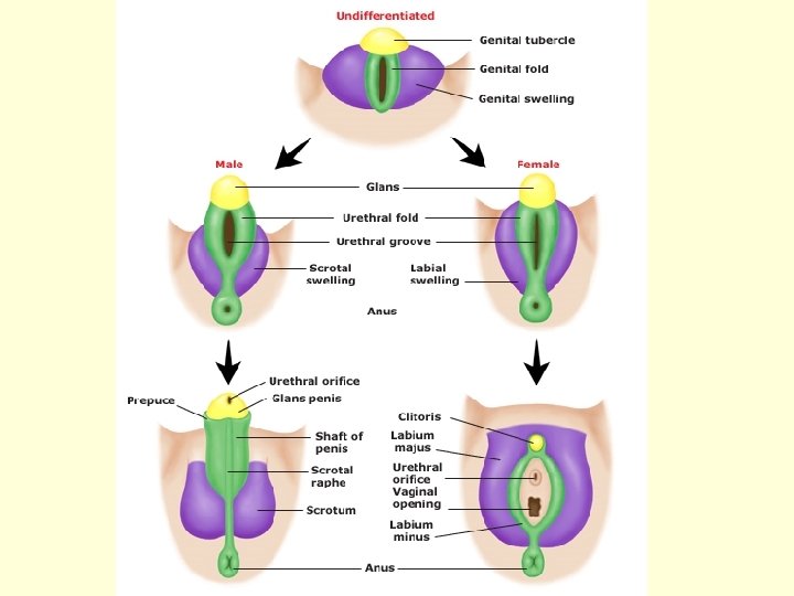 Development of external genatalia (indifferent – differentiated stage) Genital tubercle [tuberculum genitale Urethral (cloacal) folds [plicae genitales Labio-scrotal swellings [tori genitales