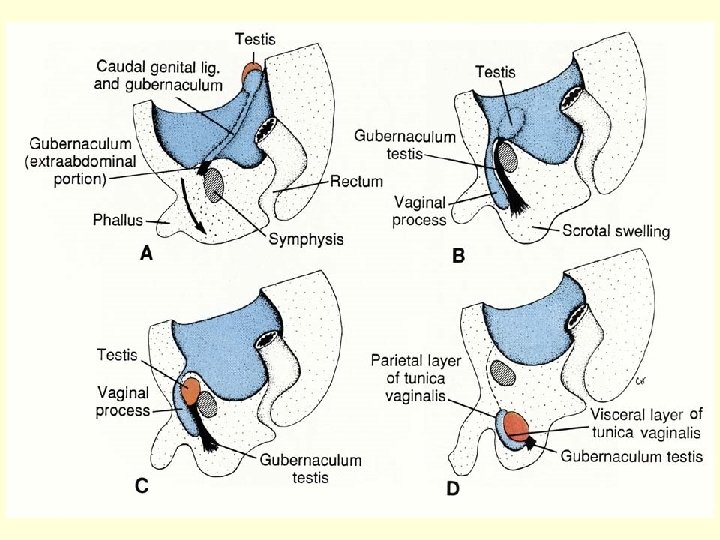 Position of gonads during development • Gonad develops in only short, lumbal part of genital (gonadal) ridge (Th 6 – S 2) • Cranial part - disappeares • Caudal part transforms into gubernaculum • Testes – descensus into the scrotum • Ovaries – change also their position due to fusion of Müllerian ducts and formation of broad ligament (lig. latum uteri)