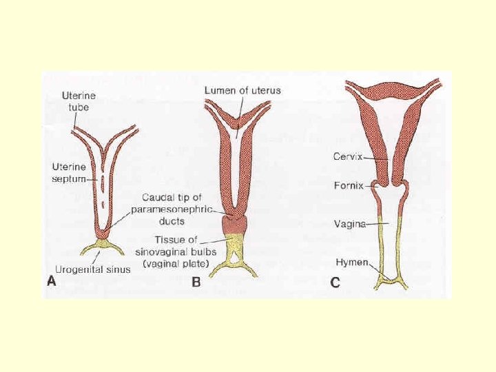 Differentiated stage of development: Müllerian duct: Wolffian duct: Oviduct Uterus Cranial part of vagina Ductus epididymidis Ductus deferens Ductus ejaculatorius Ductuli efferentes in epididymis and rete testis originate from mesonephric tubules (see mesonephros)