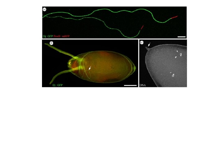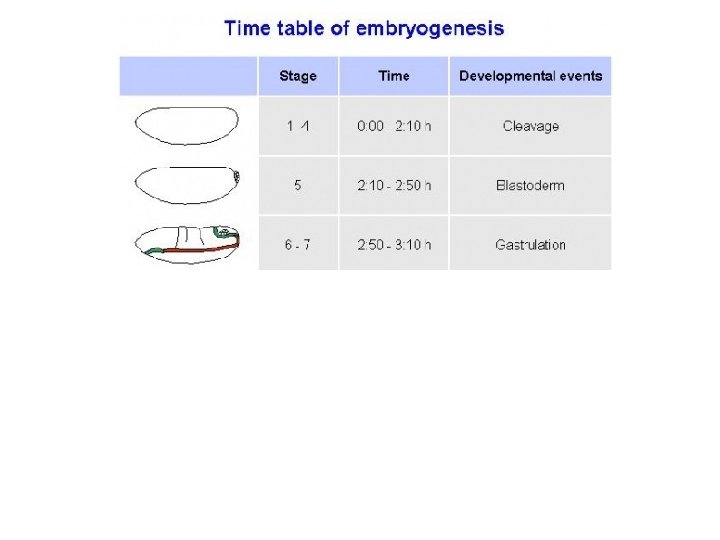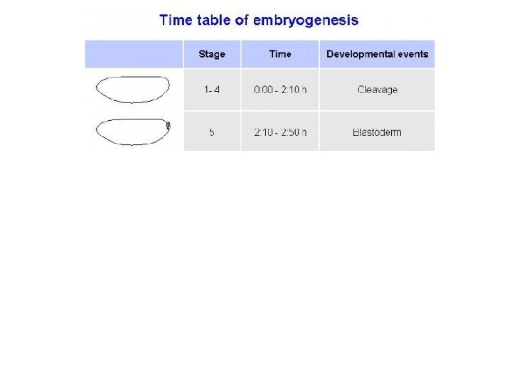 Embryonic development in Drosophila: • Development begins with fertilization. • Prior to fertilization, molecular gradients exist within the eggs. Polar cytoplasm occurs at the posterior end---example of maternal effect. • 2 nuclei fuse after fertilization to form a zygote. • 9 mitotic divisions occur without cell division, and after 7 divisions, some nuclei migrate to the polar cytoplasm (posterior) creating germ-line precursors. • Other nuclei migrate to the cell surface and form blastoderm precursor. • 4 more mitotic divisions occur and all nuclei are separated by cell membranes.