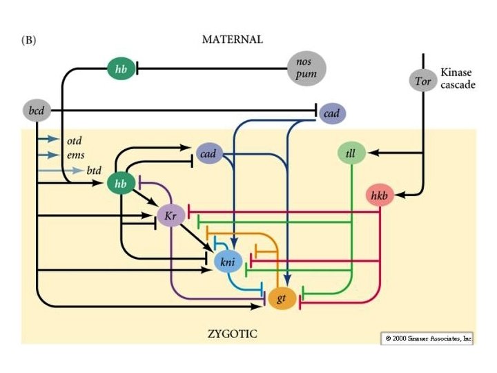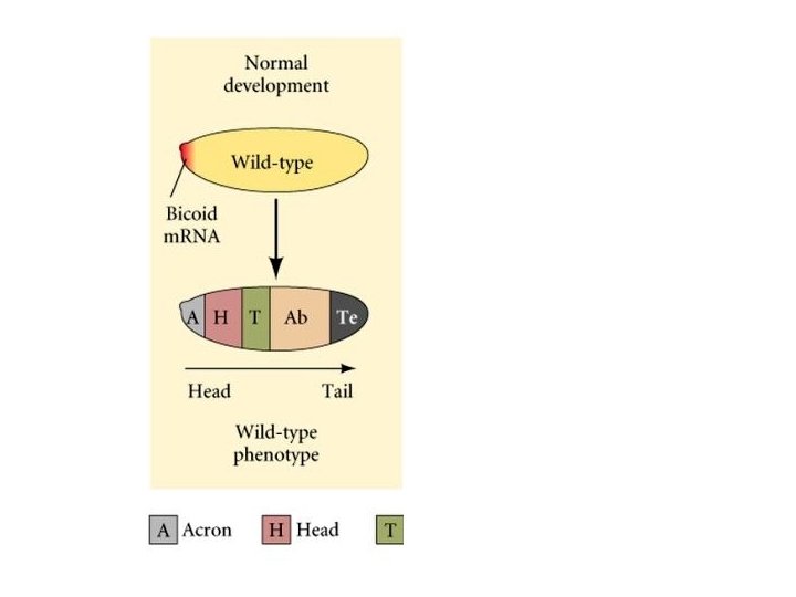 1. Maternal effect genes Expressed by the mother during egg production; they control polarity of the egg and the thus embryo. bicoid gene • Regulates formation of anterior structures (mutants possess posterior structures at each end). • Gene is transcribed during egg production, and expressed after fertilization. nanos gene • Regulates abdomen formation (m. RNAs collect in posterior of the egg). torso gene • Transcription and translation occur during egg production. • Occurs throughout the eggs, but is only active at the poles.