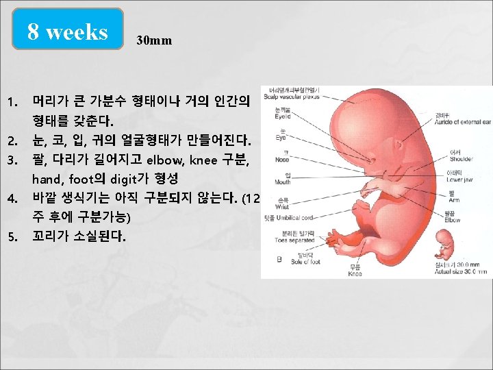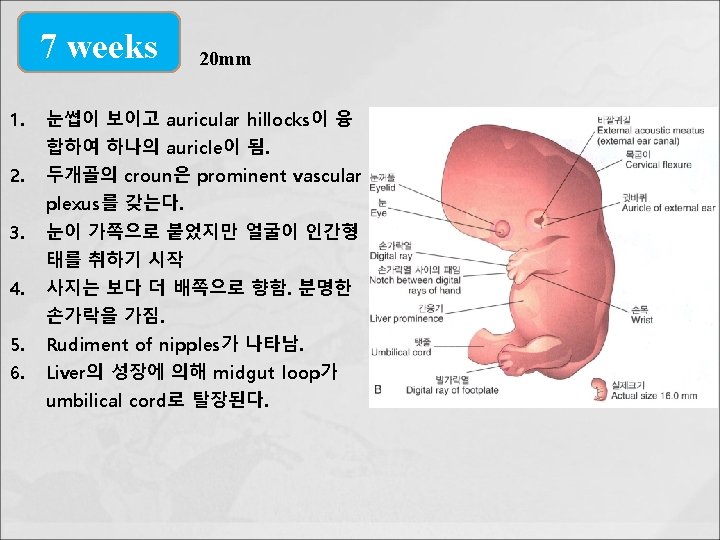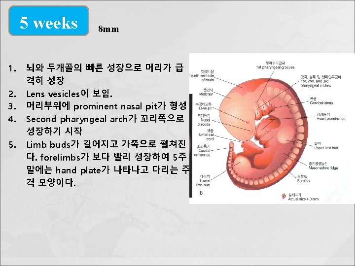 4 weeks 5. Otic pit (→ ear), lens placode (→ eye) 출현 6. 4쌍의 pharyngeal(branchial) arch 형성 → 얼굴 형성, pharynx가 됨. 7. Somite 형성이 완성; 20일 (1쌍) ~28일 (30 -35쌍) 8. Connecting stalk과 yolk sac의 나머지 부분 (vitelline duct)이 umbilical cord를 만든다. 9. upper & lower limb bud 출현 ; upper 발생 진행 속도가 lower보다 1일 더 빠름. primordium이 각 장기에서 생겨나기 시작함. 10. Other → heart와 vessel 형성 (3~7주) → 대부분의 organ primordium 형성