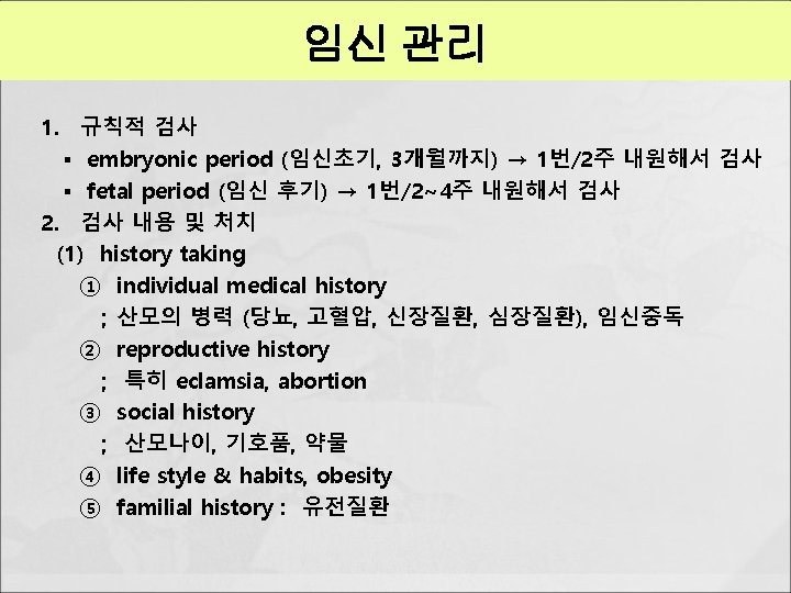 임신 관리 (2) ultrasonography ① 태아나이 확인 ② 정상성장확인 – 성장지연 의심 ③ 임신진단 보조 – 융모막융모 채취, 양수채취 ④ 딴곳 임신진단 ⑤ 선천성이상 탐지 (3) chronic disease 관리 (4) nutrition – well balanced diet (2500 kcal 이상) 20~30 % 증가 (5) exercise, travel, alcohol 3. Common complains ; nausea backache