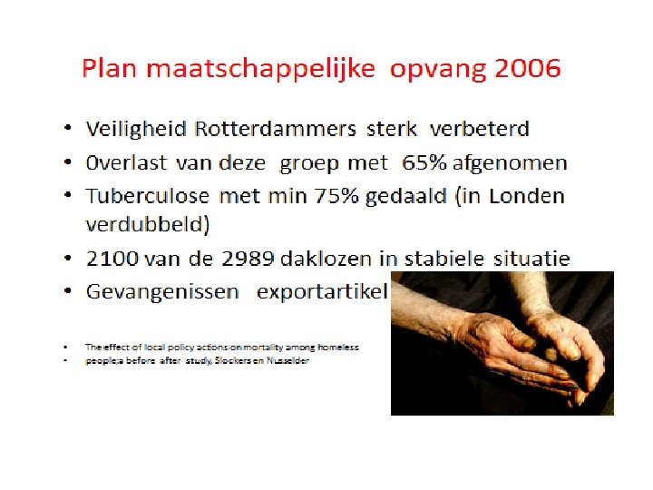 Aanbevelingen Dordrecht/Venlo • • • Brede aanpak Woonvormen langdurige zorg Aandacht verwarde mensen Outreachende GGZ Sluitend vangnet