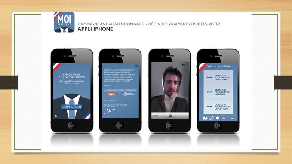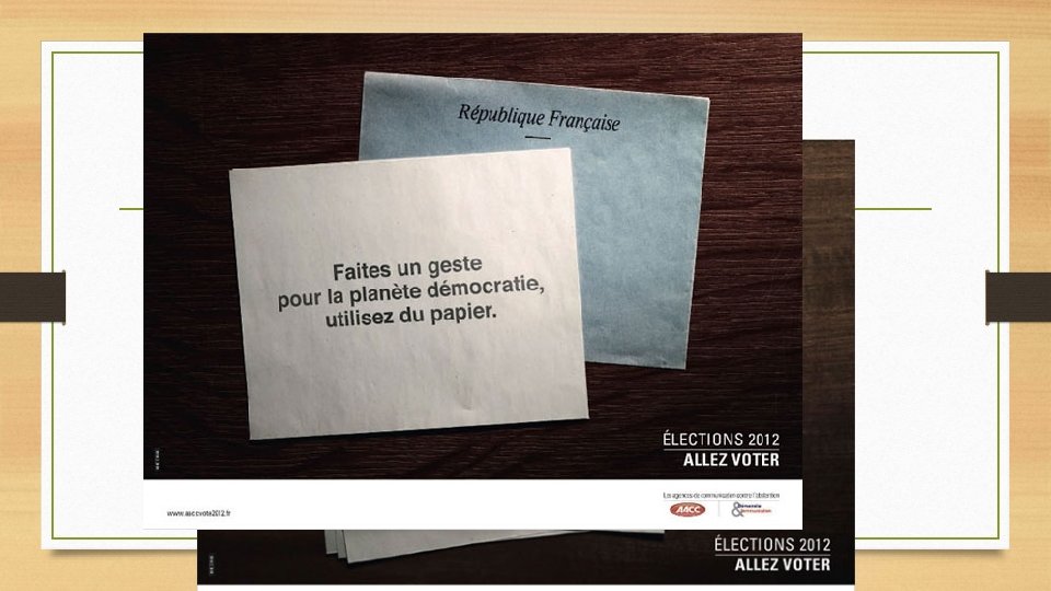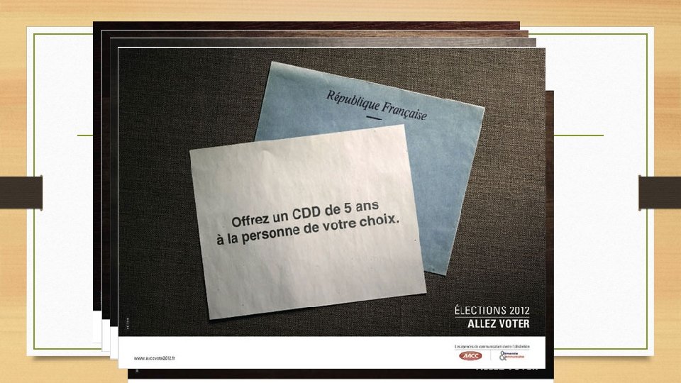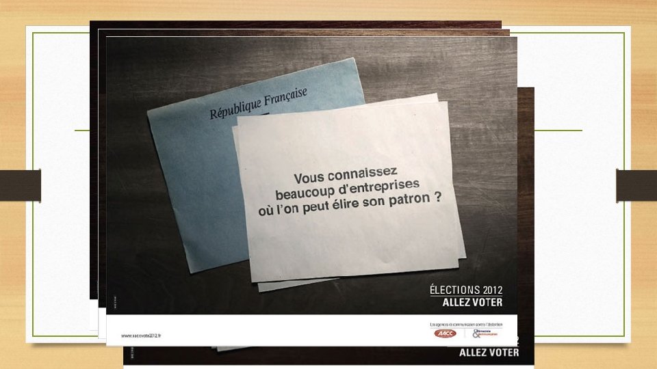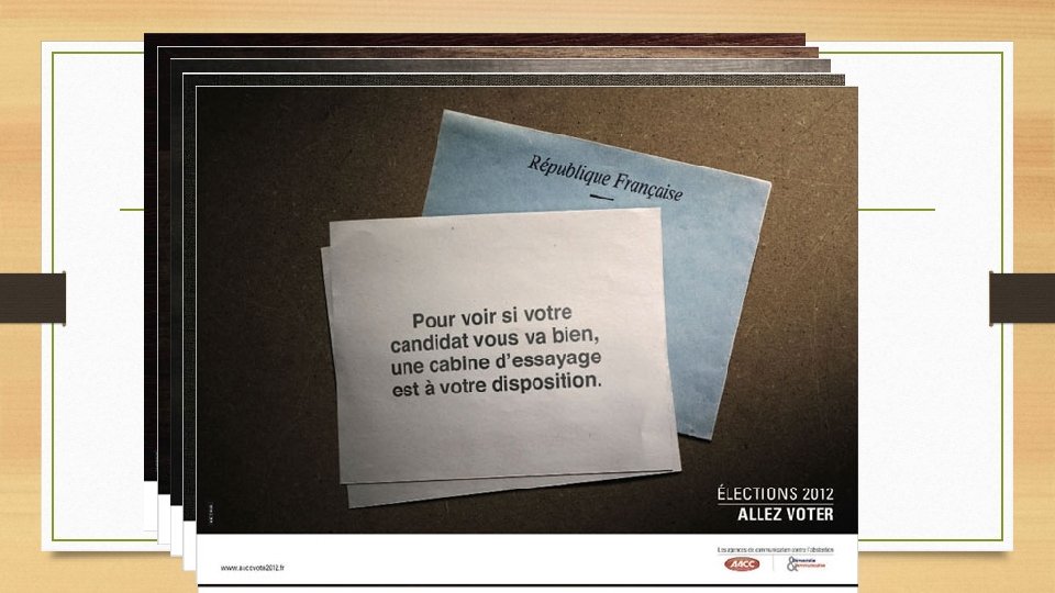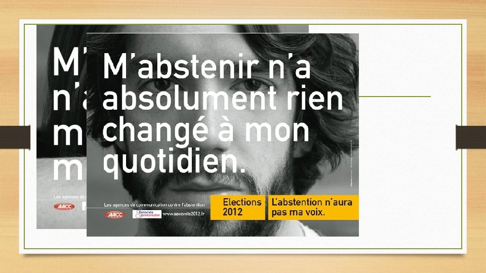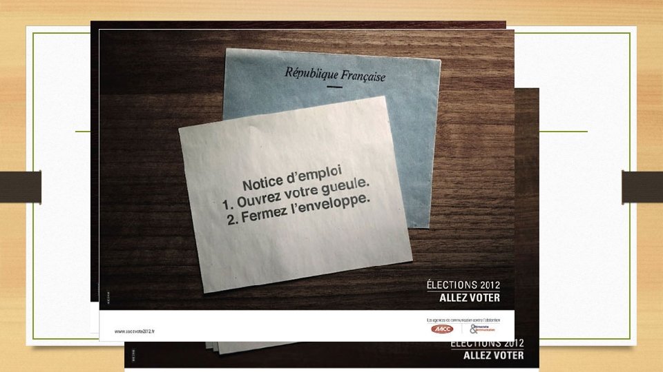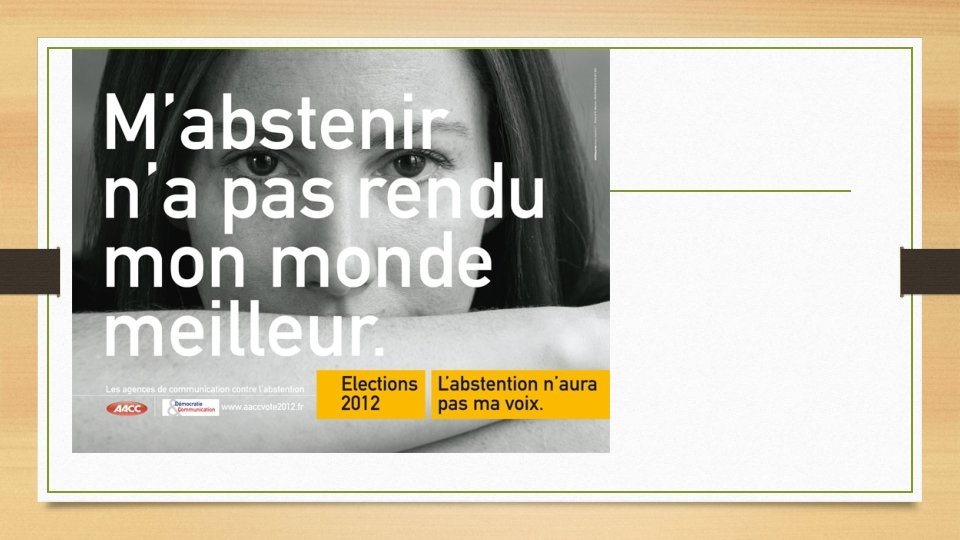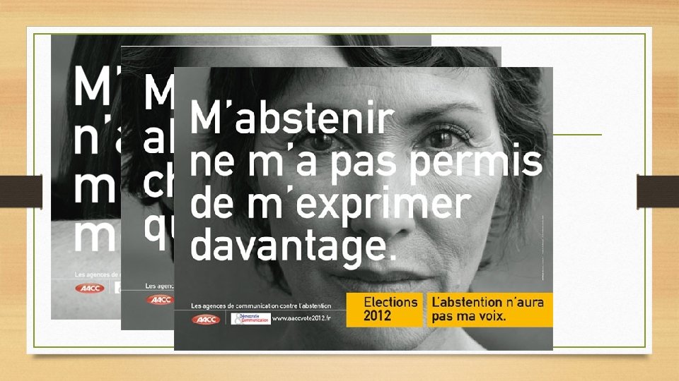 LE VOTE EST UN MOYEN EFFICACE D’ACTION • APPUI SUR DIFFERENTES CAMPAGNES POUR LE VOTE • CAMPAGNES DES AGENCES DE COMMUNICATION CONTRE L’ABSENTION A L’OCCASION DES ELECTIONS PRESIDENTIELLES DE 2012 Source : site aaccvote 2012. fr