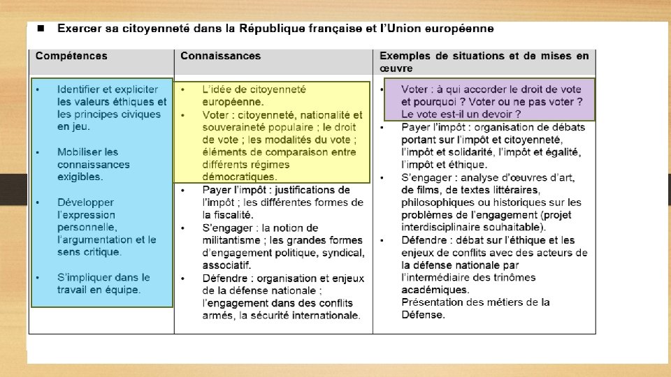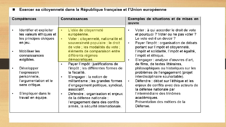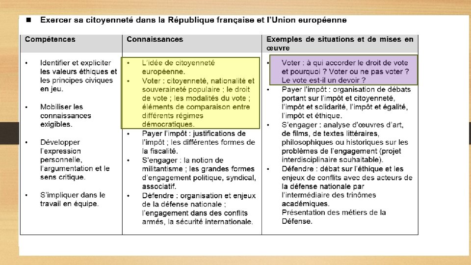 2ème étape : identification des connaissances exigibles et des possibles situations et mises en œuvres SELON VOUS… Connaissances et mises en œuvre Qu’est-ce que VOTER ? Pour qui ? Citoyenneté Nationalité Souveraineté populaire Éléments de comparaison entre les différents régimes démocratiques A qui accorder le droit de vote et pourquoi ? Comment ? Les modalités de vote Depuis quand ? Le droit de vote Pourquoi ? Voter ou ne pas voter ? Le vote est-il un devoir ? Qui vote ?