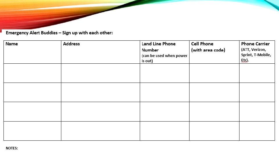 “EMERGENCY ALERT BUDDY” SYSTEM Why have an Emergency Alert Buddy? • Your CELL PHONE may be the only form of quick communication if the power is out and your phone system (cell and/or landline) needs electricity or the internet to work. • “Cross-Pollinate” phone carriers and visibility in neighborhood. • During a fire, a cell phone tower (from ATT, Verizon, Sprint, T-Mobile, etc. ) could be down. • One neighbor may see a fire down the street while the other neighbor can’t.