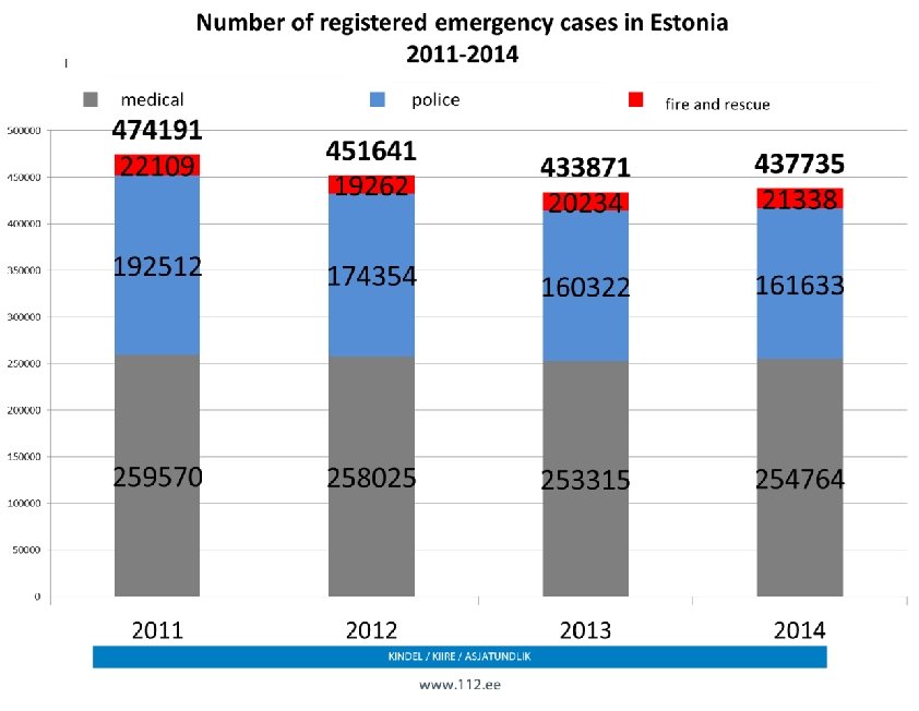 Estonian Emergency Response Centre • Estonian Emergency Response Centre (EERC), rescue organisation in the area of government of the Ministry of the Interior is handling 112 calls • Supervision of the service of processing of emergency messages is performed by the Ministry of the Interior • 112 service is financed from state budget • Citizen satisfaction with 112 service 93% in Estonia (2014 Survey)