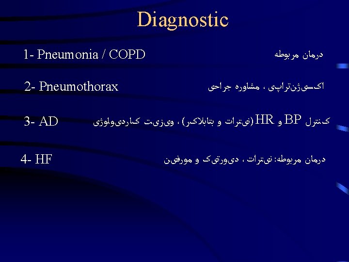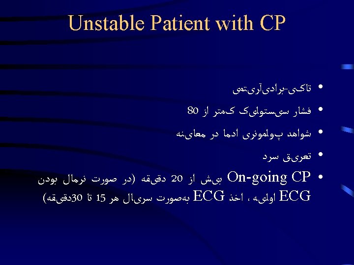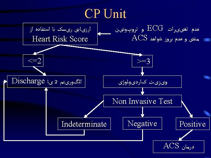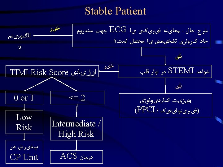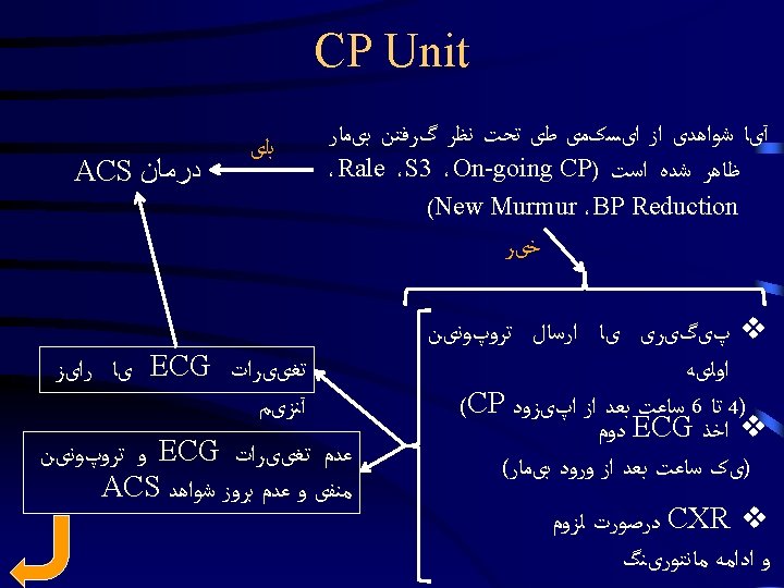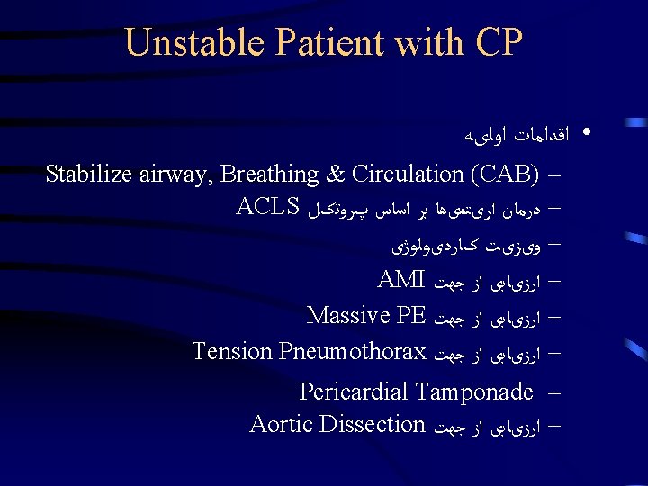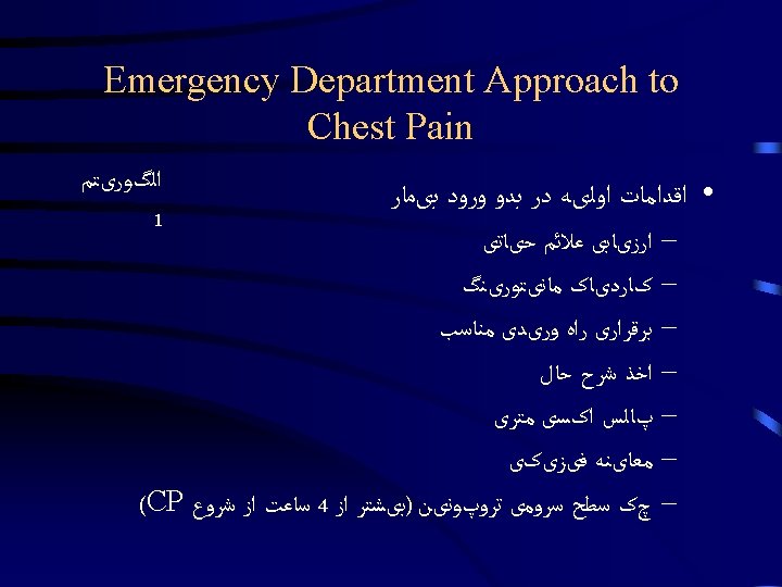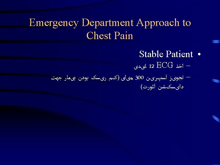Emergency Department Approach to Chest Pain Dr Hamidi Slides: 25 Download presentation Emergency Department Approach to Chest Pain Dr. Hamidi Medical University of Birjand Stable Patient Stable Patient Stable Patient CXRay Diagnostic Nondiagnostic ﺍﻟگﻮﺭیﺘﻢ 2 Stable Patient ﺍﻟگﻮﺭیﺘﻢ 2 Diagnostic 1 - Pneumonia / COPD 2 - Pneumothorax AD 3 - Widened Mediastinum, & Aortic knob prominent 4 - Evidence of HF sudden onset severe sharp or tearing pain at onset or Pulse or BP discrepancy Un. Stable Patient Un. Stable Patient Un. Stable Patient Un. Stable Patient Un. Stable Patient Un. Stable Patient Non. Diagnostic 1 - Revaluation for ACS <4 2 - Wells’ Score Calculation >4 D-dimer checking Confirm PTE ﻭیﺰیﺖ کﺎﺭﺩیﻮﻟﻮژیﺴﺖ 3 - History, Physical Exam & ECG Tamponade ﻭیﺰیﺖ کﺎﺭﺩیﻮﻟﻮژیﺴﺖ Non. Diagnostic CP Unit