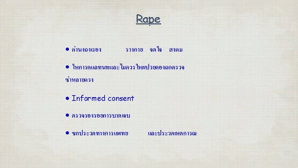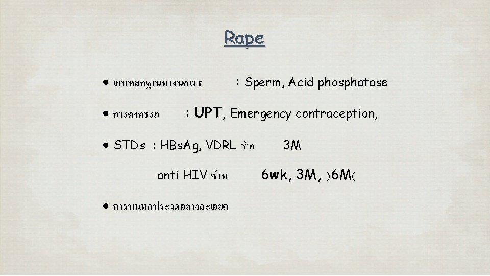STDs q Hepatitis B vaccine / HBIG กรณทราบผกระทำวาตดเชอ q HIV prophylaxis - High risk group, อยางชาไมเกน 72 hr - TDF )300 (+ 3 TC )300 (OD x 28 D - TDF) 300(/FTC) 200 (OD x 28 D