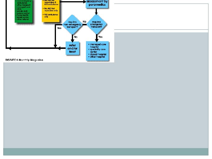 � � � � Prehosp Emerg Care. 2012 Apr-Jun; 16(2): 204 -9. Epub 2012 Jan 12. Utilization of prehospital dispatch protocols to identify low-acuity patients. Studnek JR, Thestrup L, Blackwell T, Bagwell B. Source Carolinas Medical Center, The Center for Prehospital Medicine and Mecklenburg EMS Agency, Charlotte, North Carolina 28232, USA. jonst@medic 911. com Abstract OBJECTIVES: To describe the experience of a U. S. emergency medical services (EMS) agency utilizing a dispatch algorithm to identify low-acuity patients and determine whether secondary telephone triage by a nurse was associated with subsequent hospital admission among those patients. METHODS: This was a retrospective study of all patients meeting the low-acuity Omega classification by the Medical Priority Dispatch System (MPDS) in a large urban EMS system, conducted in two phases. Patients were excluded from the study if a refusal for transport was obtained, the call was received from a third-party caller, the MPDS system was not used, the patient was being referred from a skilled nursing facility, school, or university nursing office or physician's office, or if the call was referred to the Carolina Poison Center. Patients were enrolled over two phases using two different versions of the MPDS protocol, and in phase 2 patients were offered the option of speaking with an advice-line nurse. The outcome of interest was emergency department disposition, classified as hospital admission or discharge home. Admission to an intensive care unit (ICU) bed was also collected as a subcategory of hospital admission. RESULTS: Of the 1, 862 patients in phase 1, 69. 3% were discharged home from the emergency department, whereas in phase 2, 73. 0% of the 1, 078 patients were discharged home. Individuals were most frequently admitted to the hospital across both phases if they had a dispatch determinant of pregnancy, psychiatric/behavioral, fall, sick person. Hospital admission was also associated with receiving an EMS or emergency department procedure. There were 530 patients in phase 2 who underwent secondary triage by an adviceline nurse. Among this cohort of patients, 134 (25. 3%) required subsequent hospital admission, with a further three (2. 2%) requiring an ICU admission. CONCLUSIONS: This study identified a method for classifying patients during the dispatch period as low-acuity while attempting to ensure that those individuals received the medical care that they needed.