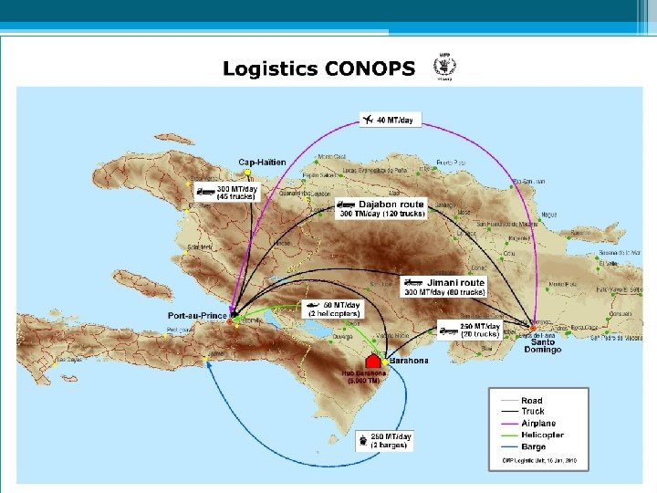 WFP Logistics: Cluster Haiti A trucking fleet of over 200 trucks from both the Dominican Republic and Haiti was leased for the transport from Santo Domingo to Port-au-Prince and within the earth-quake zones for both food and Non-Food Items. Sea-barge were used to shuttle humanitarian cargo from Portau-Price to the different ports in Haiti, currently WFP is shuttling cargo from Santo Domingo as result of customs issues. Three helicopters and two airplanes were used for the operations. They were used for locations that can not easily be reached by road or sea and for fast emergency interventions.