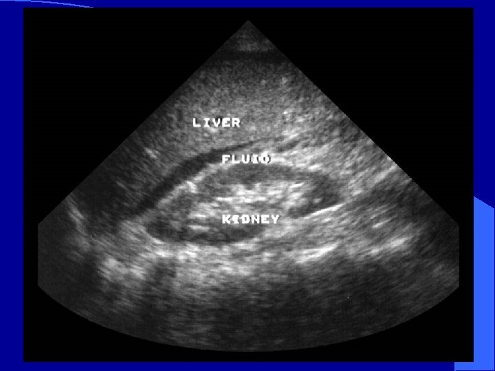 Mimics of Fluid in RUQ l Perinephric fat – May be hypoechoic like blood – Usually evenly layered along kidney – If in doubt, compare to left kidney l Abdominal inflammation – Widened extra-renal space – Echogenicity of kidney becomes more like the liver parenchyma