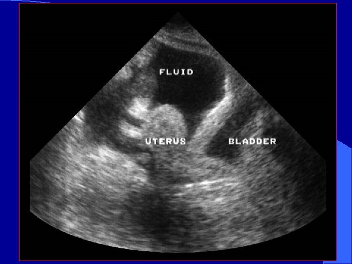 Pelvic View – Sagittal clot Fluid in front of the bladder l If bladder is empty or Foley already placed: Trick of trade l – IV bag on abdomen – Scan through bag bladder