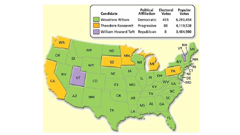 Election of 1912 • Republican Split • Primary Elections – Roosevelt • Republican nominee. . . Taft • Progressive (“Bull Moose”) Party • Roosevelt • “New Nationalism” • Democrats • Woodrow Wilson • “New Freedom” • Socialist Party • Eugene V. Debs